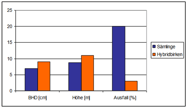 In vitro vermehrte selektierte Hybridbirken weisen eine hervorragende Wüchsigkeit gegenüber Sämlingen auf, wie die von der NW-FVA in Escherode erhobenen Daten belegen. Besonders in Bezug auf das Merkmal Stammform werden die Vorteile des selektierten Pflanzenmaterials deutlich.