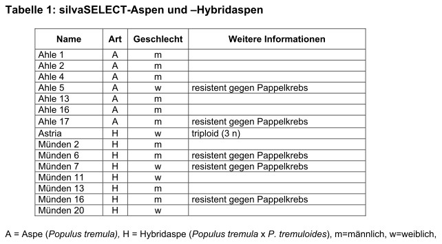 Die schnellwüchsigen Aspen (Populus tremula) sind in Mitteleuropa heimisch und sehr anpassungsfähig. Die Hybridaspen entstanden durch Kreuzung der europäischen Aspe mit der nordamerikanischen Populus tremuloides. Die geprüften Klone eignen sich zur Stammholzproduktion auf forstlichen und landwirtschaftlichen Standorten.